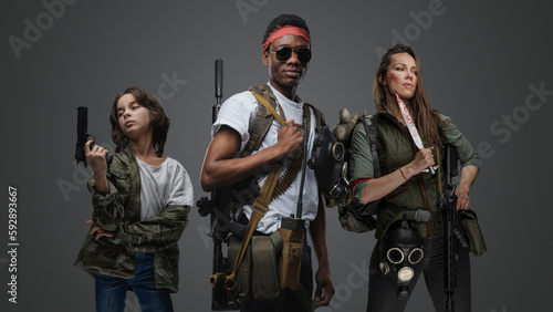 Shot of stylish black guy and little girl with woman in post apocalyptic setting.