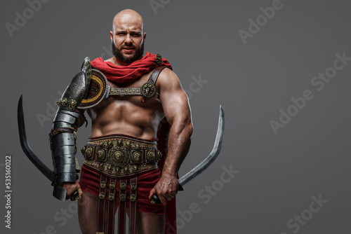 Shot of violent praetorian warrior with two swords dressed in armor and red cape.