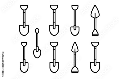 Shovel line icon pack outline vector. Set of shovel icons for graphic design, web, apps, advertising, business cards. Cartoon illustration with transparent background. Minimalist toolkit concept