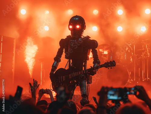 Show de rock com robôs tocando e cantando ao invés de humanos. A imagem ilustra a integração da inteligência artificial no entretenimento e a substituição de músicos e compositores humanos por robôs