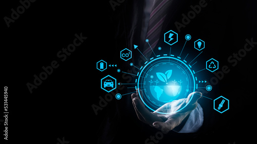 Show hand hold green energy, CO2 and environment with icon. Reduce CO2 emission concept in the hand for environmental