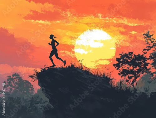 Show the runner on a sunrise trail symbolizing perseverance from a unique tilted perspective