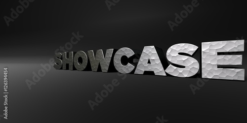 SHOWCASE - hammered metal finish text on black studio - 3D rendered royalty free stock photo. This image can be used for an online website banner ad or a print postcard.