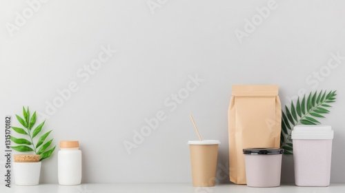 showcase selection of eco-friendly packaging options arranged on clean neutral background with ample copy space