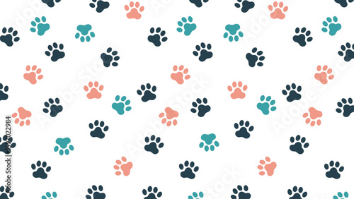 showcases a charming seamless pattern of colorful paw prints in various shades of blue, pink, and teal on a crisp white background. Ideal for pet-themed projects, textiles, or digital art, it provides