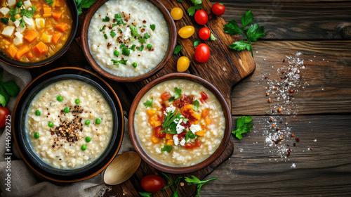 showcasing various traditional porridge dishes from different cultures beautifully presented on rustic wooden.