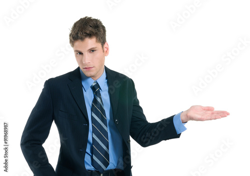 Showing, giving or presenting - Portrait of a young business man. with his hand outstretched,