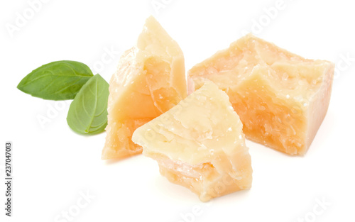 shredded parmesan cheese and basil leaf isolated on white background cutout