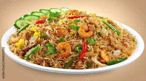Shrimp Fried Rice Aromatic Asian Cuisine on Elegant White Plate.