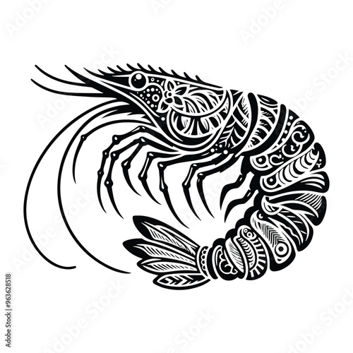Shrimp in zentangle art, stencil logo, black and white animal illustration