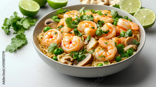 Shrimp noodle soup with fresh herbs and lime in ceramic bowl