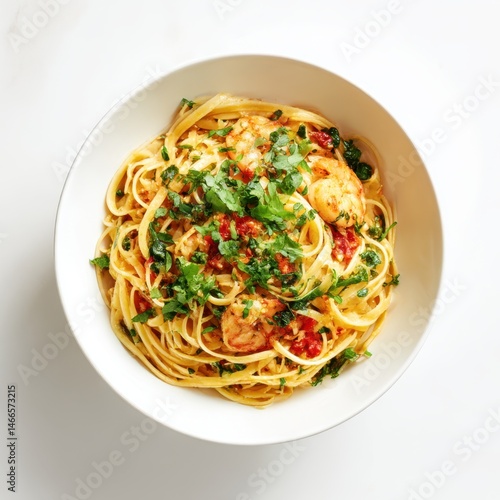 Shrimp pasta with herbs isolated on white background