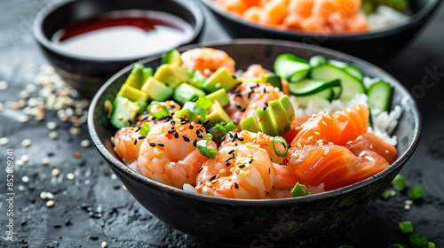 Shrimp poke bowl rice avocado soy sauce and sesame on a black stone table