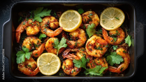 Shrimp prawns sizzling in a dark pan with fresh cilantro and lemon slices, a vibrant, healthy seafood dish ready to serve bright flavors and rustic presentation for dining