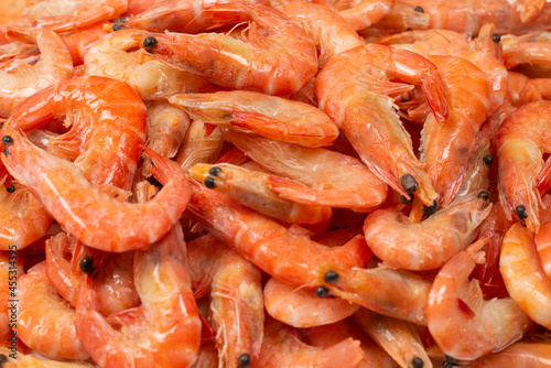Shrimps background texture. A lot of shrimps. Cooked shrimps.