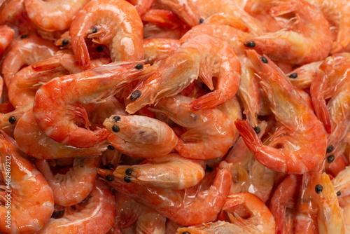 Shrimps background texture. A lot of shrimps. Cooked shrimps.