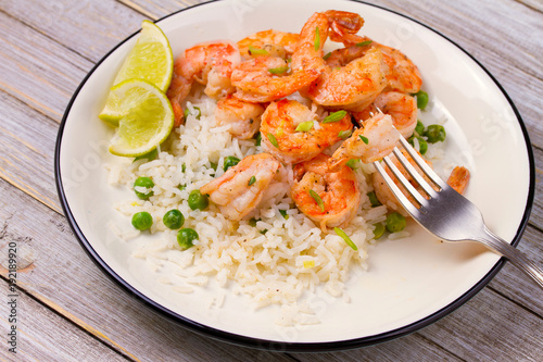 Shrimps with ginger rice and green peas, lime on white plate on wooden background