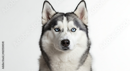 Siberian husky dog looking alert and proud against a bright white background