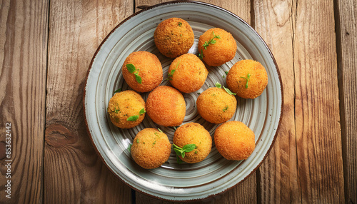 Sicilian arancini on plate. Fried rice balls. Delicious Italian dish. Tasty food. Cooking concept. Top view