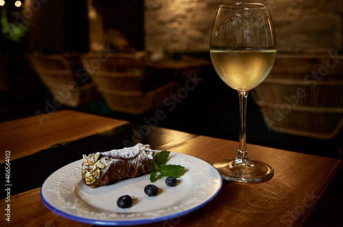 Sicilian cannoli roll with blueberries on a white ceramic plate and a glass of misted white wine on a restaurant table with a blurred background.