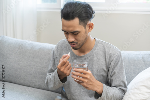 Sick asian young man, male holding tablet pill on hand, painkiller medicine from fever, stomach pain, headache for treatment, take drug or vitamin with glass of water on at home. Health care concept.