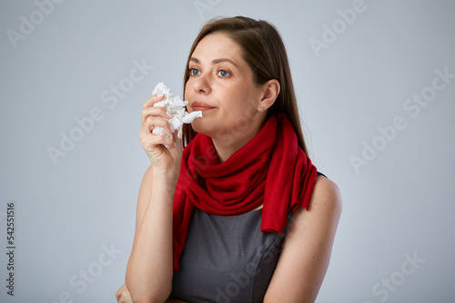 Sick business woman wearing red scarf using tissue for her nose, isolated advertising portrait.