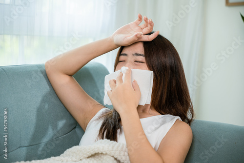 Sick woman sitting under blanket on sofa and sneeze with tissue paper in living room, Asian young female blowing nose sneezing in tissue at home, fever caught cold