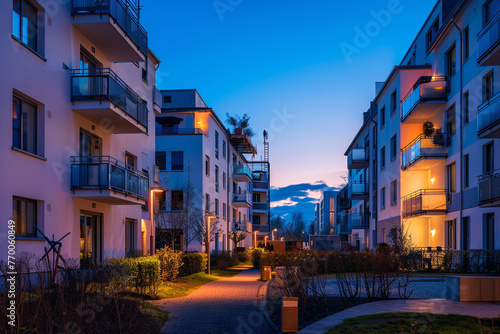 Side angle view of European apartment complex during blue hour, tranquil beauty against blue-toned sky.