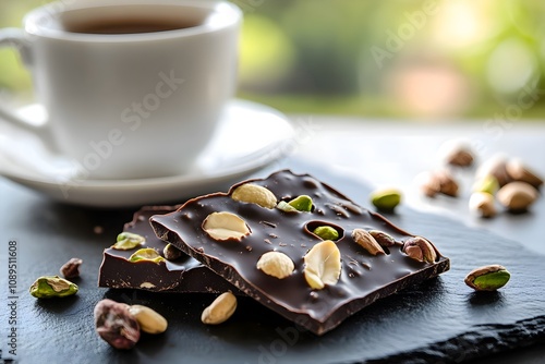 Side macro shot of dark chocolate bark with pistachios, pecans, and cashews, set on a coffee table with scattered nuts and a cup of coffee in a cozy setting