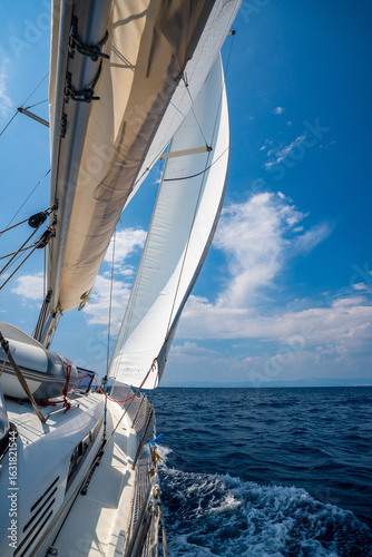 Side of a sailing yacht cutting through the sea with full sails near Croatia. Motion, freedom, sailing lifestyle and adventure on the open water.