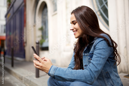Side of smiling young woman sitting on sidewalk and looking at mobile phone