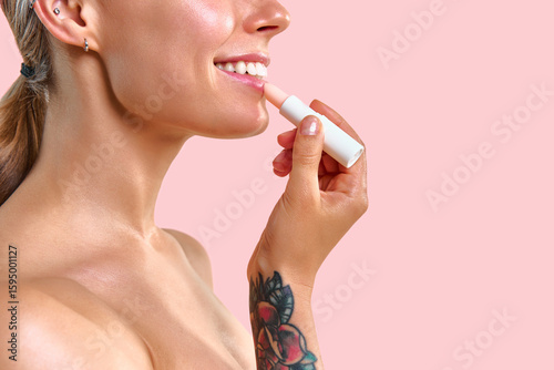 Side portrait – a girl applying lip balm on a soft pink background. Lip care. Space for advertising.