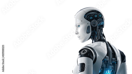 Side Portrait of a Futuristic Artificial Intelligence Robot with Advanced Mechanical Details Isolated on White Background.
