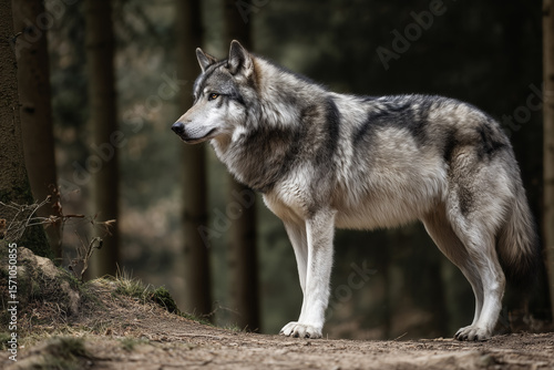 Side profile of a gray wolf walking along a forest trail in side lighting