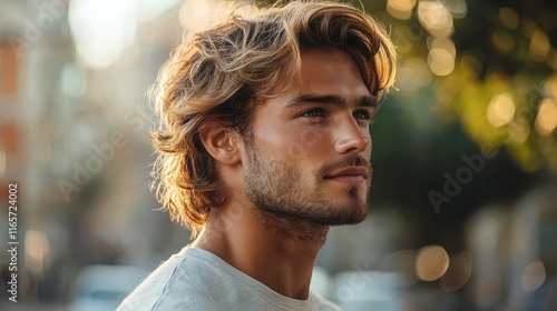 Side profile of a man with wavy hair enjoying a sunny day in a vibrant urban environment