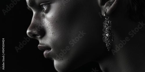 Side profile of a person with intricate, shiny, dangling earring as the main focus of the image.