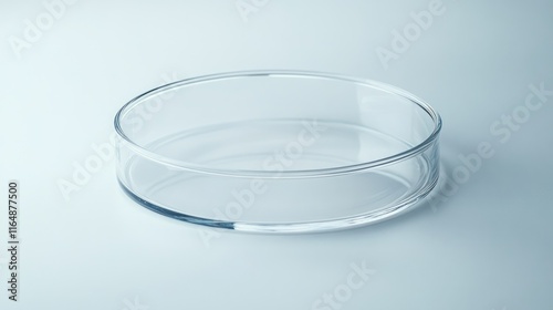 Side profile of a scientific petri dish, positioned on a pristine white surface, capturing its clear, circular shape and sterile appearance