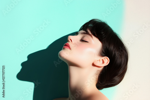 Side profile of a serene woman with closed eyes enjoying soft sunlight indoors, with natural shadows