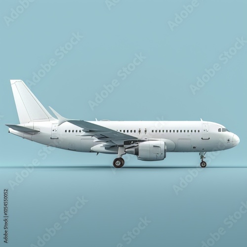 Side profile of a shiny, white airliner in light blue background.