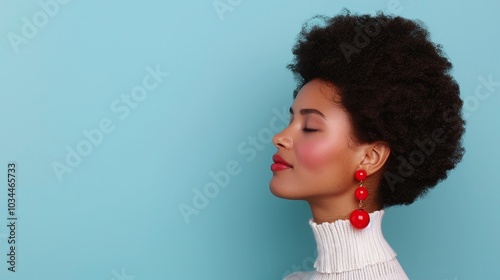 Side profile of an African-American woman with afro-textured hair, red earrings, red lips, glowing skin, white turtleneck, minimalist light blue background, beauty and fashion focus.