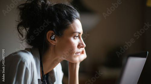Side profile of deaf woman wearing hearing aid working remotely on video call using laptop, inclusive modern workplace and remote communication