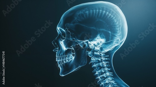 Side profile X-ray of human skull showing detailed bone structure against dark background, X-ray image of bones,