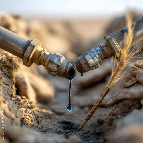 side view close-up low-angle view of two metal fuel pipes emerging from the dry cracked soil