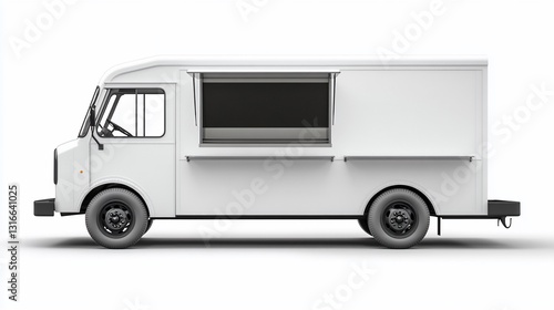 Side view of a blank white food truck with window open on a bright white background
