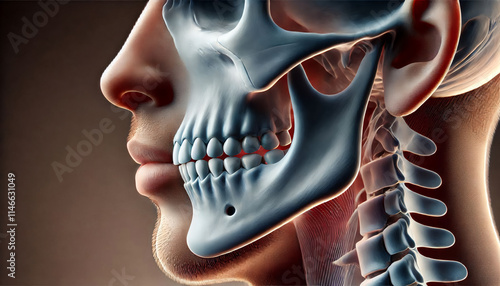 Side view of a human jawbone with a focus on the TMJ joint, highlighting the articulation points and curvature for anatomical studies.