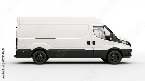 Side view of a white cargo van with black accents against a plain white background, showcasing its design and features without visible branding or logos.