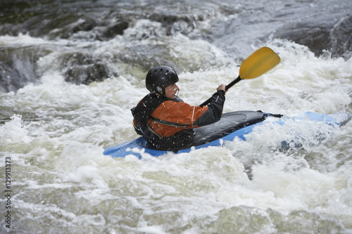 Side view of a woman kayaking in rough river