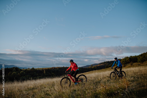 Side view of active senior couple riding bikes outdoors in countryside in autumn day.