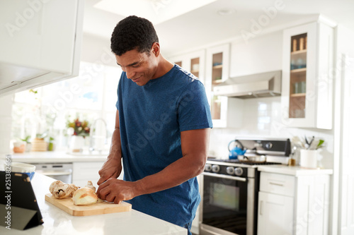Side view of adult man standing at kitchen worktop preparing food using recipe on a tablet computer, close up, selective focus
