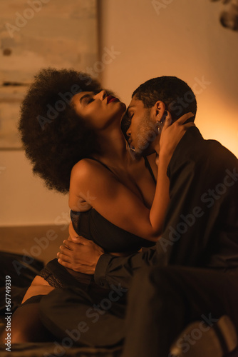 side view of african american man hugging and kissing seductive girlfriend in bedroom at night
